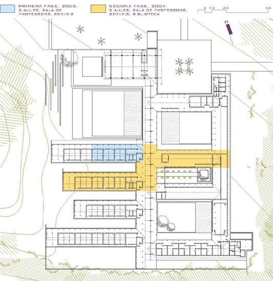 Es pot apreciar un espai de patis vinculat als equipaments estables, i la zona d'aularis articulada en filera. tot es vertebra a través d'un gran eix com un carrer cobert que té inici a la gran sala d'actes. de manera transversal hi ha un vincle de visuals entre els porxos i els espais oberts del patis potenciant la relació entre tot el campus universitari.